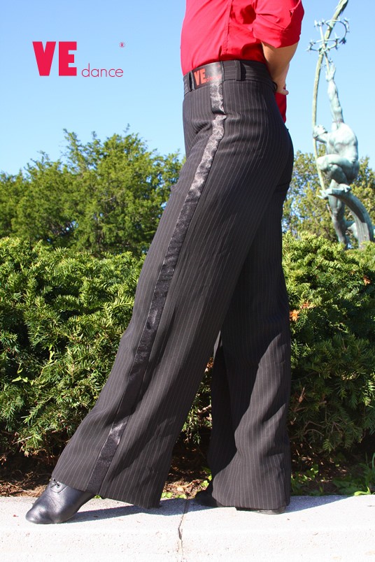 Take black to a whole new level with pinstripes. These dance pants are made of lightweight polyester, allowing your body to breathe. Perfect for competition, practices and social dancing. The fabric is soft, cool, stretches and gives, allowing you to move freely. Great for showcasing when paired with the Executive vest or Smooth jacket.