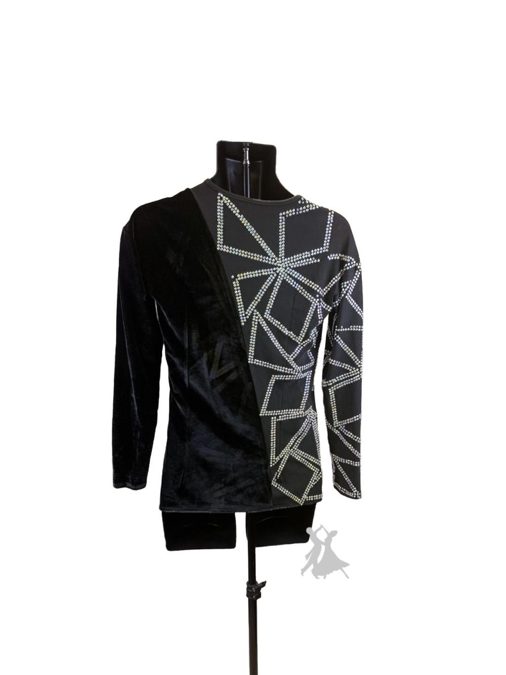 Black velvet Latin shirt with bold geometric design in AB Crystals.