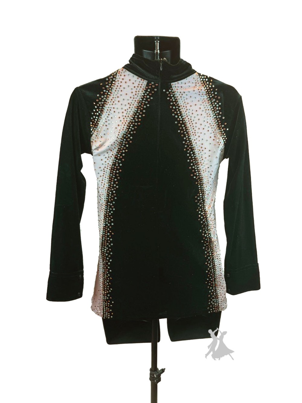 Men's latin velvet shirt with beige inset panels on both sides, and stoned with crystal and topaz crystals