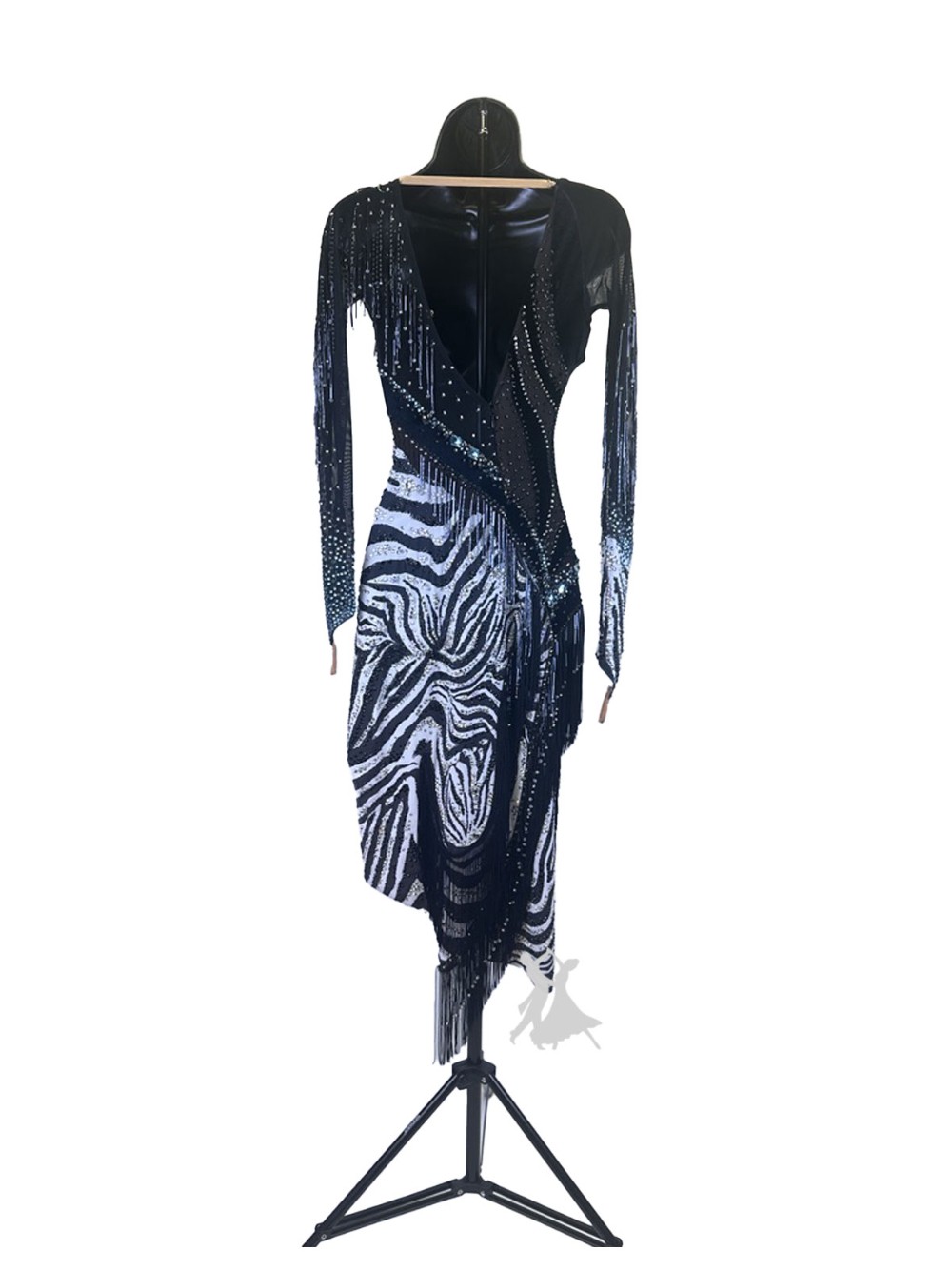 Be fiesty, fabulous, and foxy in this unique rhythm dress with black, white and royal blue adorned with Swarovski Crystals. .