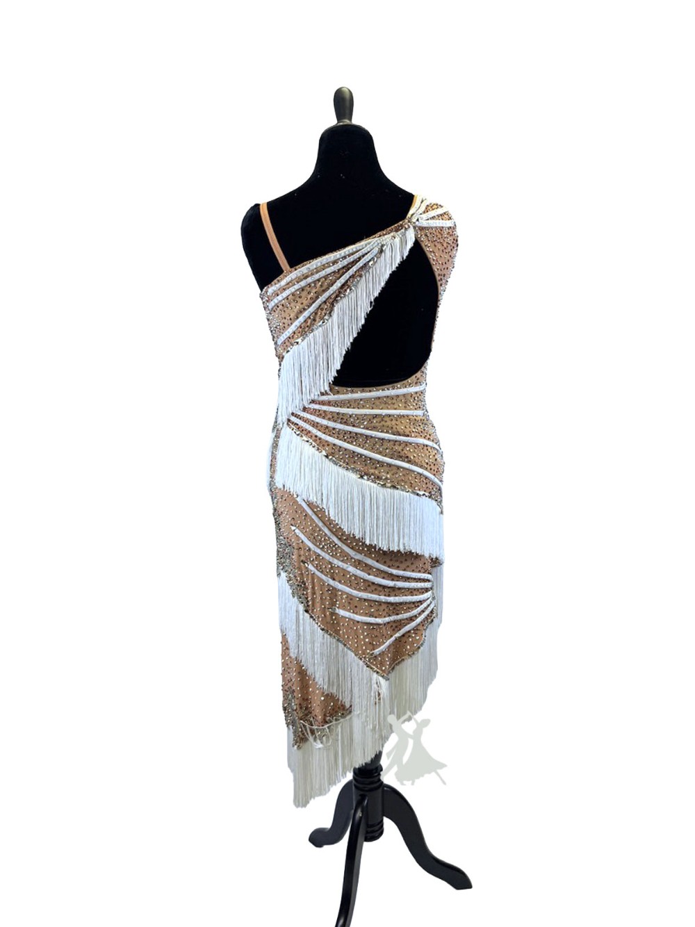 Tan dress with white fringe cross body and white accents. Swarovski crystals throughout.