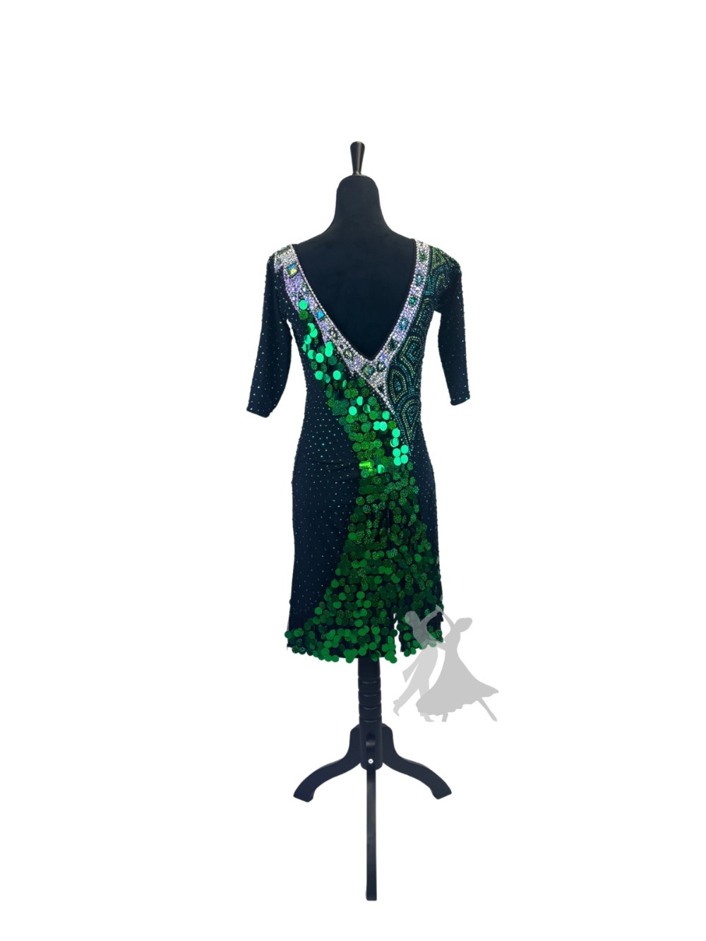 Black rhythm dress adorned with clear, emerald green and Peridot Austrian Crystals. V neckline is outlined with rows of clear crystals and beautiful designs of emerald and peridot crystals on upper right bodice and back as well as scattered all over sleeves and skirt. Gorgeous emerald coins flow down the center front and back. Slits at side and back to really go with movement. Short sleeves.