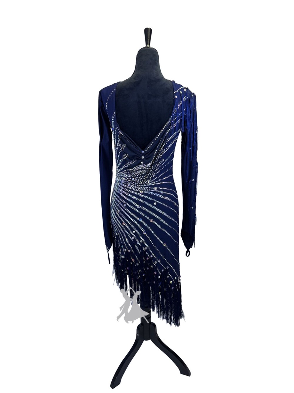 Lush dark blue Latin/rhythm dress with diagonal lines radiating from the side, creating a slimming effect. Swarovski stones included, with extra stones provided. Fringe adds great movement to the sleeves and hem of the dress.