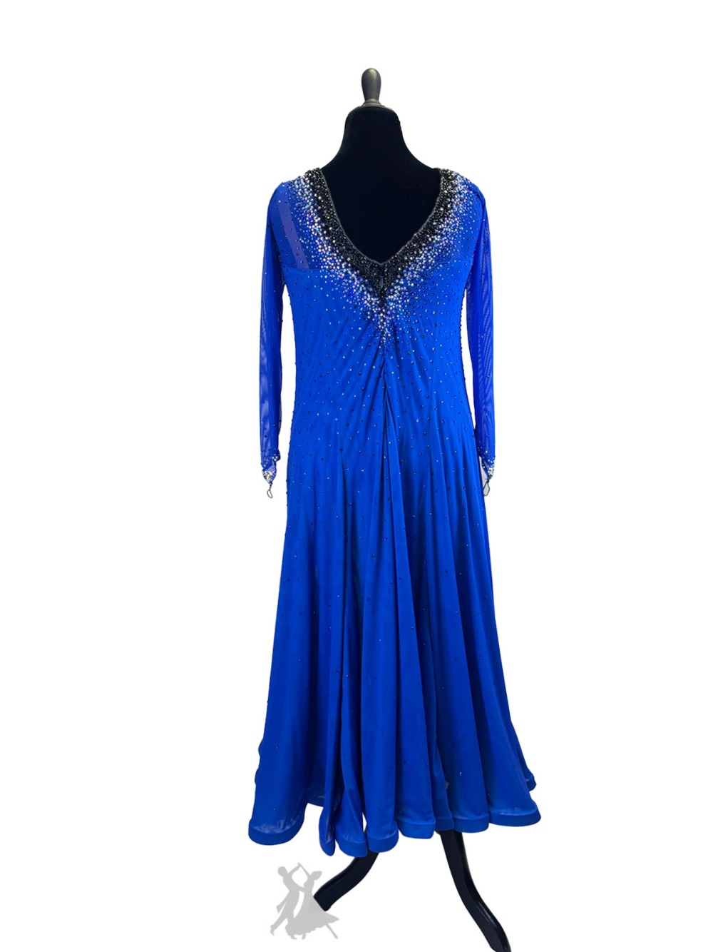 Simply elegant and figure flattering sapphire smooth dress with a V neckline trimmed in black velvet and AB Swarovski Crystals with a nude inset, Back is also V shaped with a zipper. Long sleeves. Skirt is semi-sheer layer of sapphire and lined with teal lining. Deep side slit trim mimics the neckline with velvet and AB Swarovski Crystals.